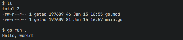 使用 go mod init github.com/gtn1024/helloworld 命令,即可创建一个新的项目,随后创建 main.go,输入如下代码:
