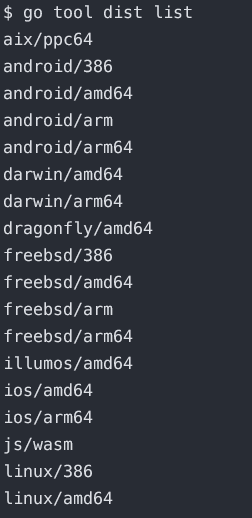 Go 语言可交叉编译的平台可以由 go tool dist list 命令查看:
