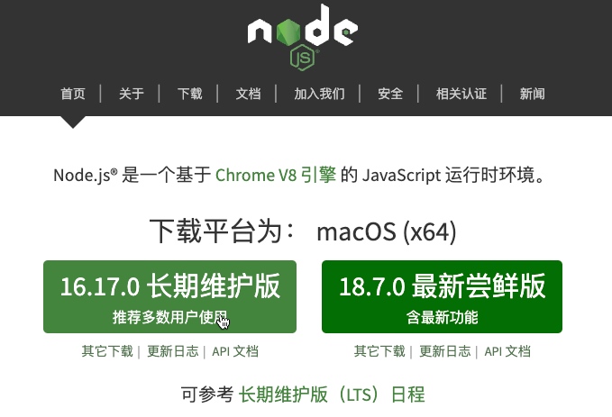 在搭建 Hexo 博客之前,需要先安装 Node.js,打开官网后下载长期维护版即可,目前最新的长期维护版为 16.17.0。