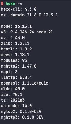 执行 hexo -v,正常显示各组件版本信息,则安装成功。