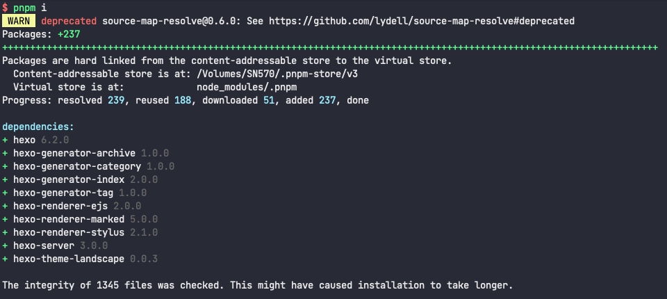 运行 hexo init my-blog 命令,hexo-cli 工具就会在 my-blog 目录下创建一个 Hexo 博客。如果他没有安装依赖,请运行 npm install 安装依赖(注意进入 my-blog 目录)。我个人使用 pnpm 进行包管理。