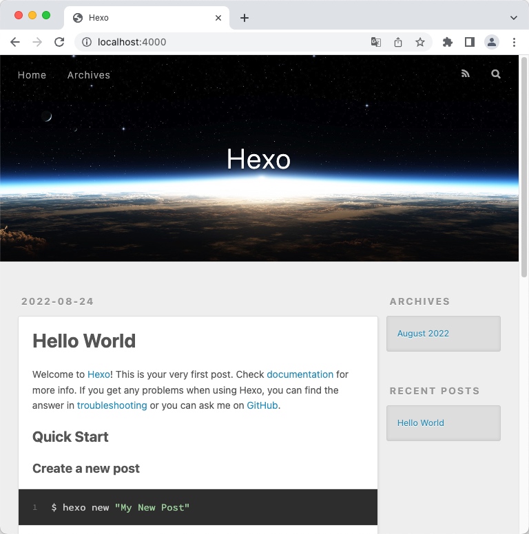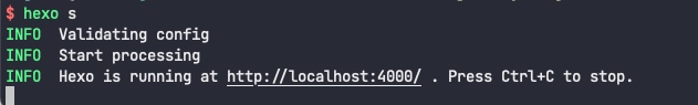 依赖安装成功后可以使用 hexo s 在本地启动服务器便于预览,一般情况下会在本机的 4000 端口开启一个 HTTP 服务。