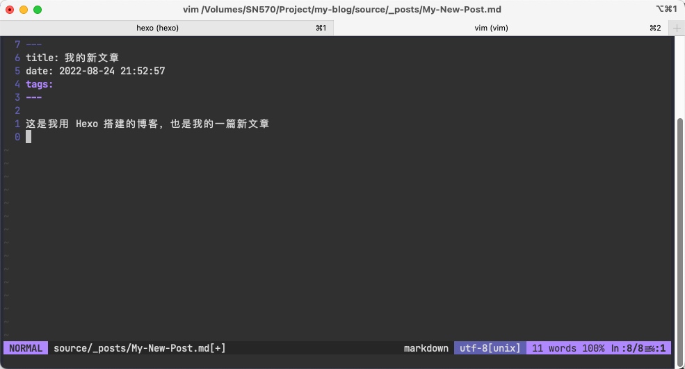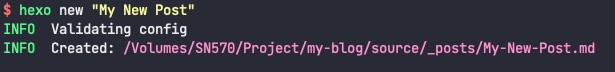 正如在上方预览里文章所说,运行 hexo new 命令可以新建一篇博客,后面需要接上博客的文件名,通常情况下我们使用英文。运行后他会在 source/_posts 目录下创建一个 Markdown 文件,该文件即为新的文章。