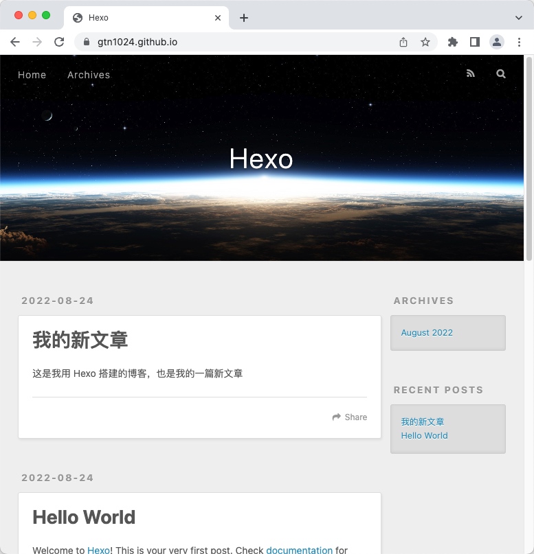 访问 用户名.github.io 即可看到刚才搭建的 Hexo 博客。