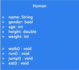 举个例子:现定义一个人类(Human),成员变量可以有姓名(name)、性别(gender)、年龄(age)、身高(height)、体重(weight)等,方法可以有走(walk)、跑(run)、跳(jump)、吃(eat)等。