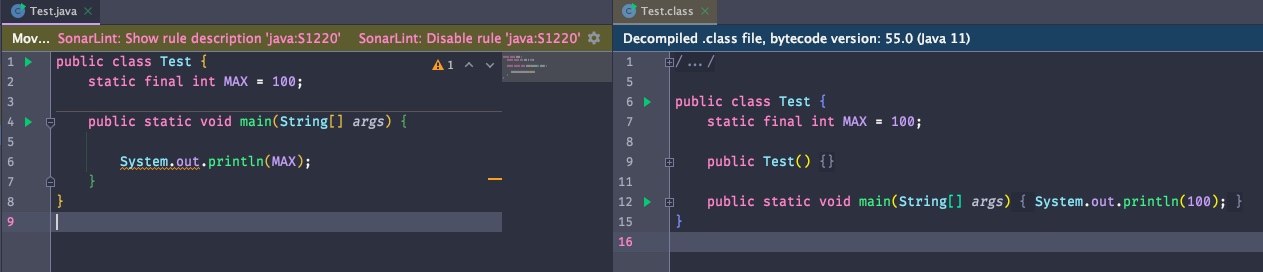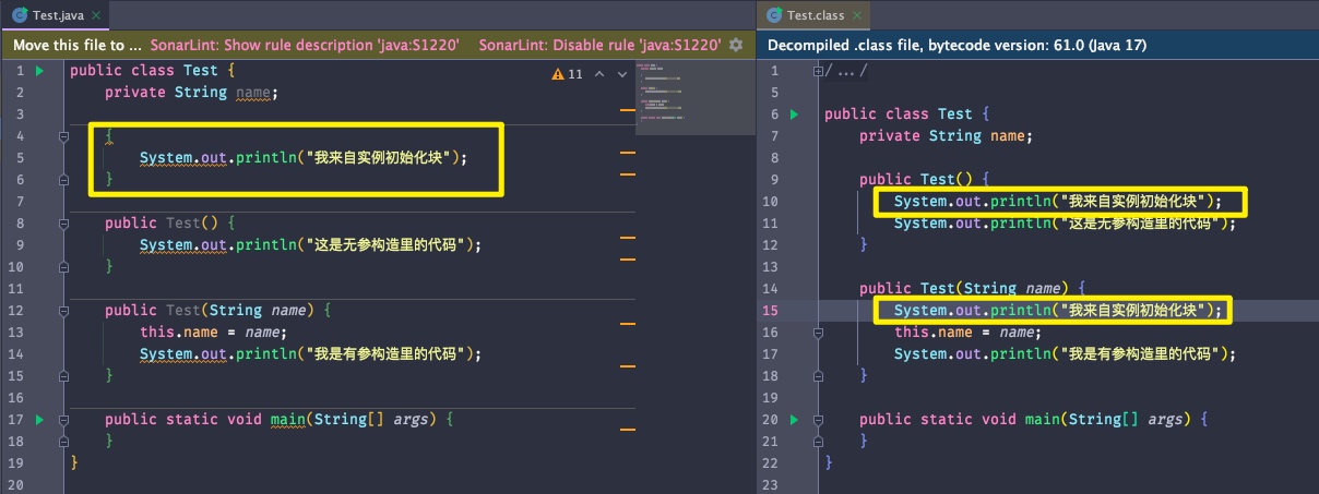 实例初始化块实际上是「假象」,块中所有代码在编译时将会被还原到每个构造器的最前面。左图为编译前的原始代码,右图为class文件反编译的代码。