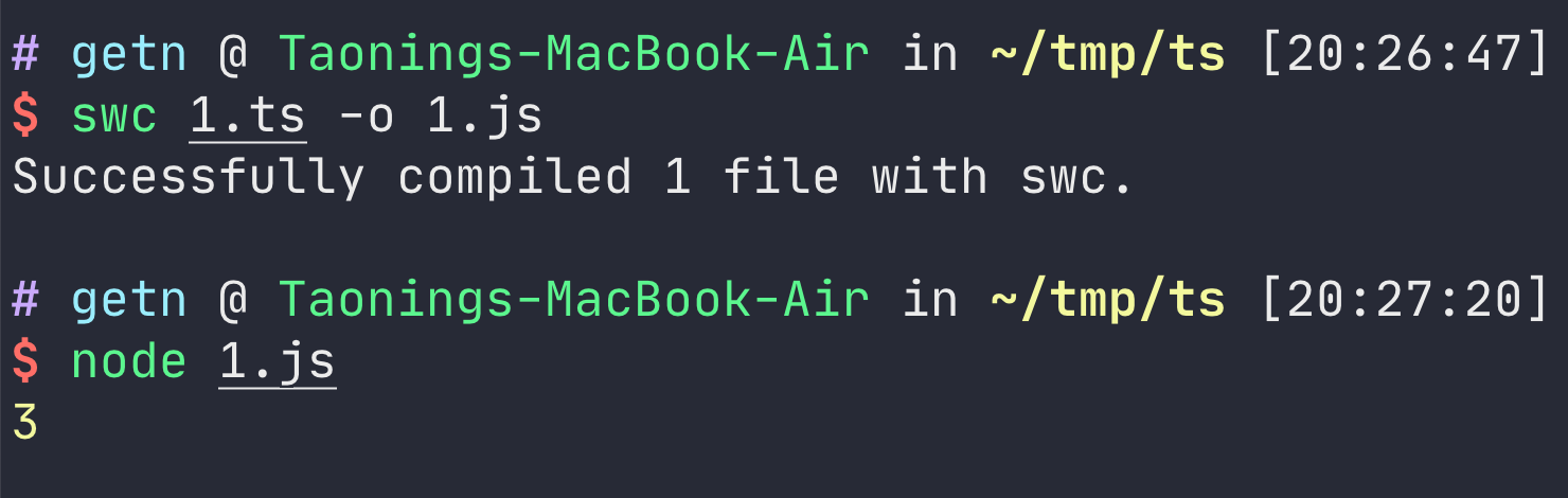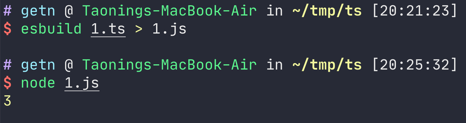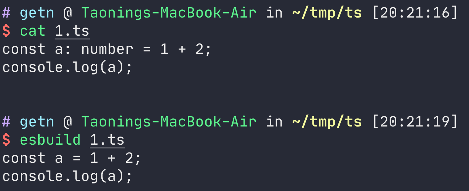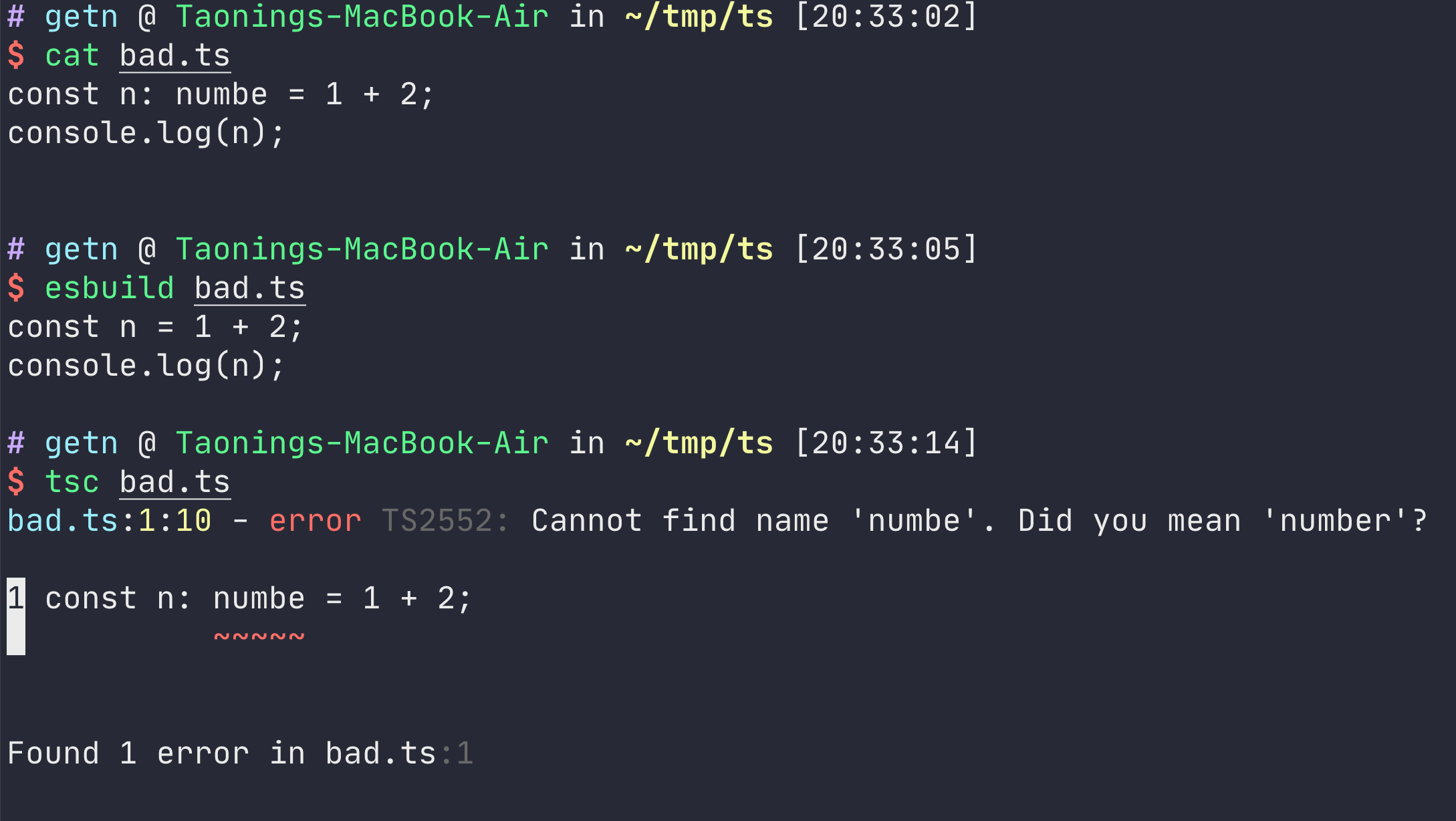 例如,我在 bad.ts 的文件中将 number 写成 numbe,esbuild 可以正常输出编译结果,而 tsc 会报错。