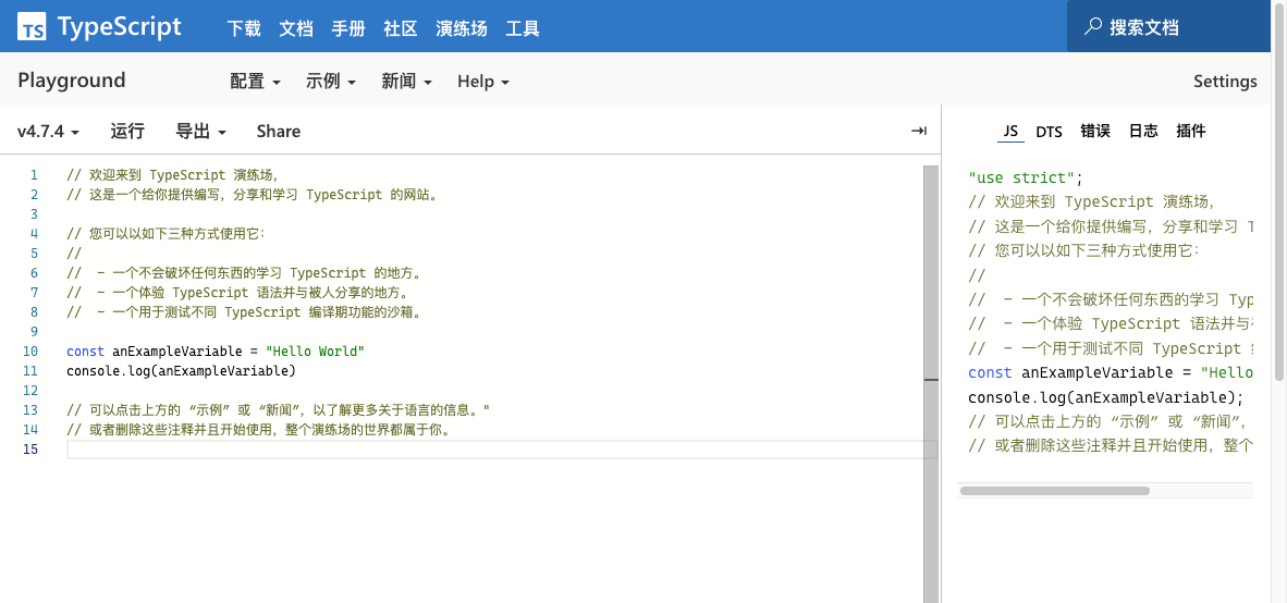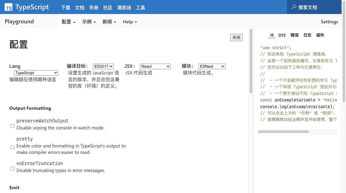 TypeScript Playground 是 TypeScript 官方提供的演练场,有大量的配置可以修改。在学习 TypeScript 语法时可以使用该演练场进行代码编写。
