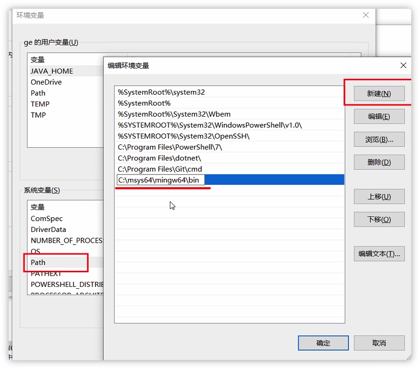 在Path变量中新建一项,设置为C:\msys64\mingw64\bin(如果修改过安装路径请对应修改一下)