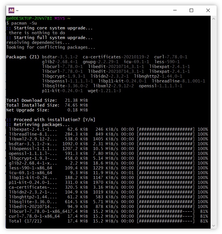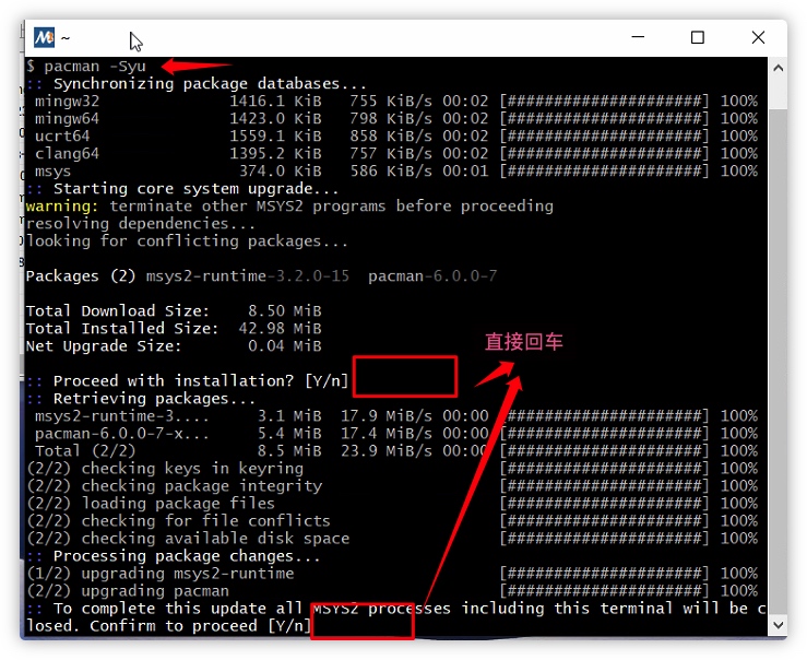 重新打开C:\msys64\msys2_shell.cmd,输入pacman -Su,过程同上。