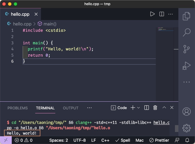 点击右上角类似播放器的按钮,如果看到下方显示Hello, world!则表示安装成功。