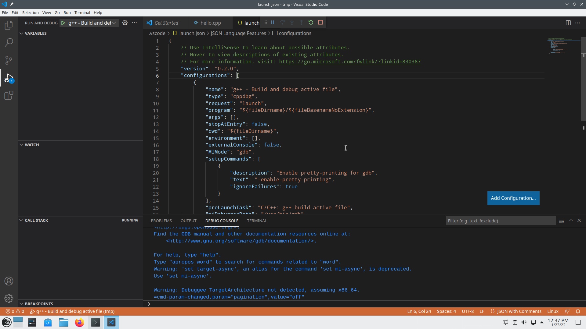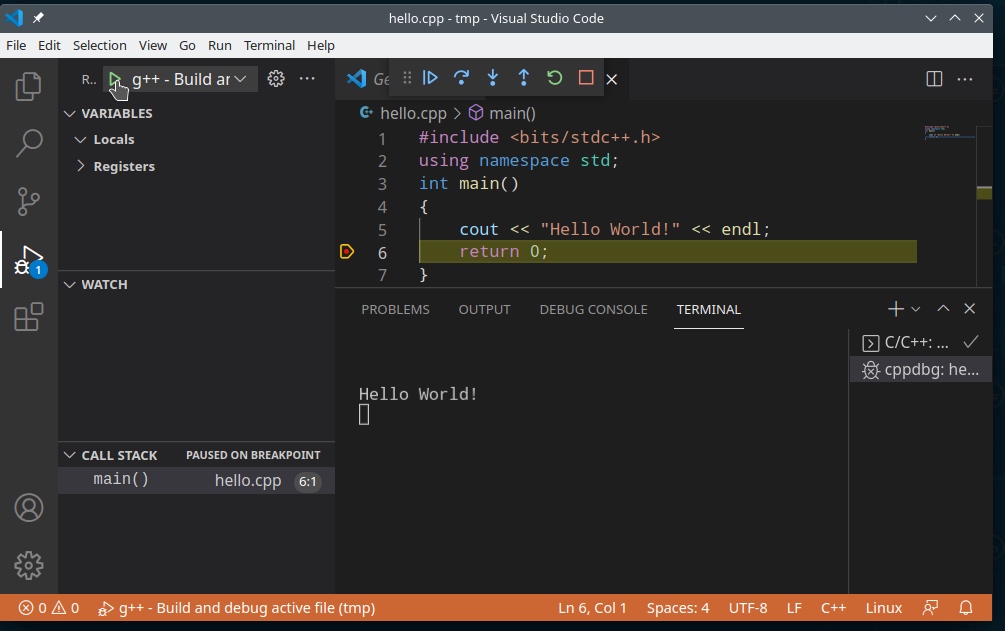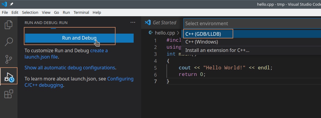 打开项目目录,点击Run and Debug选项卡,点击Run and Debug按钮。出现上方菜单选择C++(GDB/LLDB),即使用 GDB/LLDB 工具链进行调试。